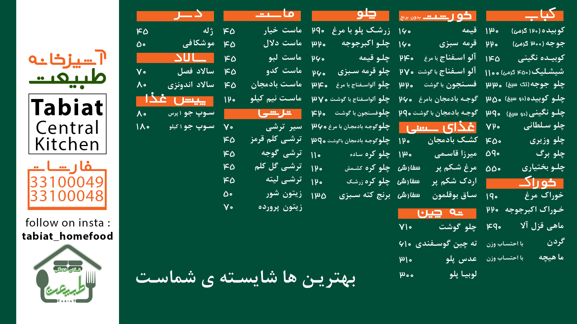 طبیعت منوی نسبتاً متنوعی دارد و معمولاً چند غذای ثابت به همراه انتخاب های ویژه روز ارائه می کند. بسته بندی غذاها محکم و حرفه ای است و طعم غذا حتی در شلوغی ها ثابت می ماند. برخورد پرسنل مودبانه و سرعت آماده سازی غذا مناسب است. برای سازمان ها و سفارش های شرکتی نیز انتخاب خوبی محسوب می شود. شما می توانید منو فروشگاه را در این لینک مشاهده فرمایید.